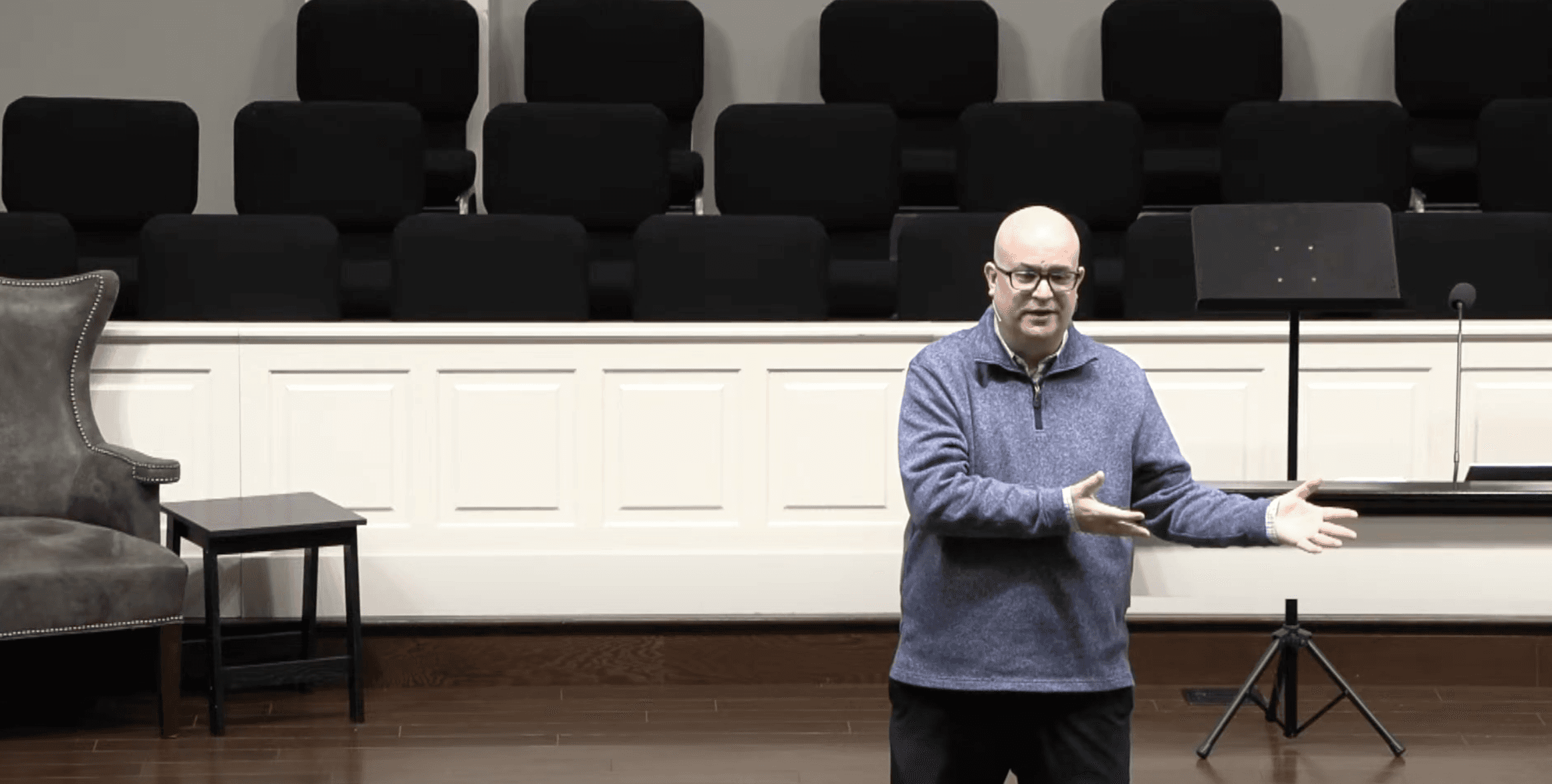 Dustin Davis teaches in the “old sanctuary” a group of 50+ adults of all backgrounds. Using the aid of a Sunday School book, they try to align each lesson with today’s challenges.